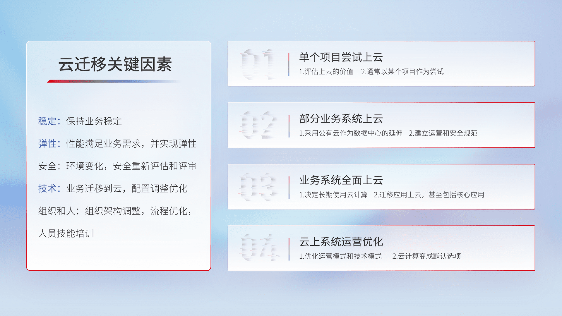 结合实际业务,,,从规划设计、、云平台选型、、、、云原生改造、、数据迁移、、、集成交付,,,,迁移全过程为客户识别最佳上云路径,,做好风险识别管理,,,,设计网络架构、、、身份权限、、、、安全审计合规、、操作审计、、、、日志审计、、、、监控告警策略、、多站点容灾设计等,,,,对云上基础设施进行整体规划,,提升IT治理水平,,以满足弹性、、、、高可用、、、、高性能的需求。。。