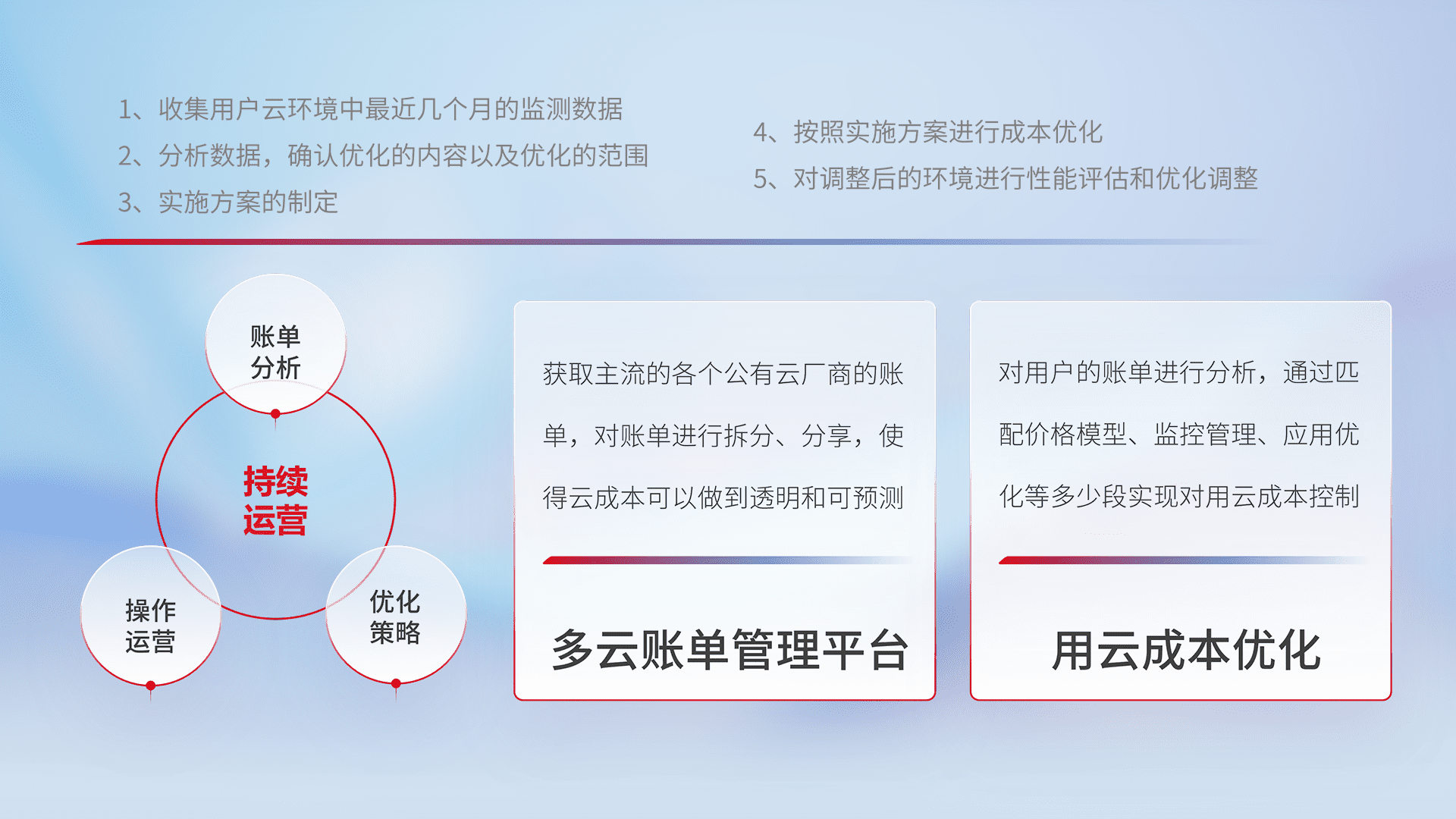 通过灵活运用多种自动化迁移工具,,,,帮助企业用户实现业务和数据高效 、、、、稳定的上云迁移和云上迁移,,,,采用自研多云纳管平台,,以中立管理模式,,,,解决多组织、、多云、、、、多运维厂商的复杂关系的管理,,保证多云平台资源配置的一致性,,,,实时掌控云资源运行数据,,运用智能化工具分析云资源多云平台的管理服务,,,透明化管理成本支出,,,,用云成本可预测、、、、用云费用可优化、、、、云资源配额有据可依。。