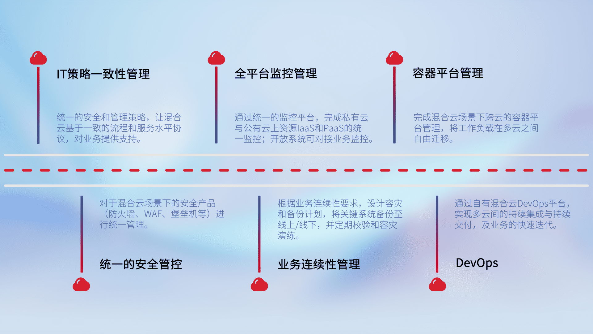 通过多云纳管,,,以统一的资源数据模型把客户的云资源进行抽象和封装,,,进而实现对多云资源的统一操作,,,,保障云资源管理的可靠性、、、、稳定性与可用性。。。量身定制化运维内容,,,配置、、、开发运维、、、补丁管理、、、备份、、、监控、、、、认证和访问管理、、、审计和日常巡检等,,,,保障在用云过程中的可靠度,,,稳定度以及高可用率。。。。