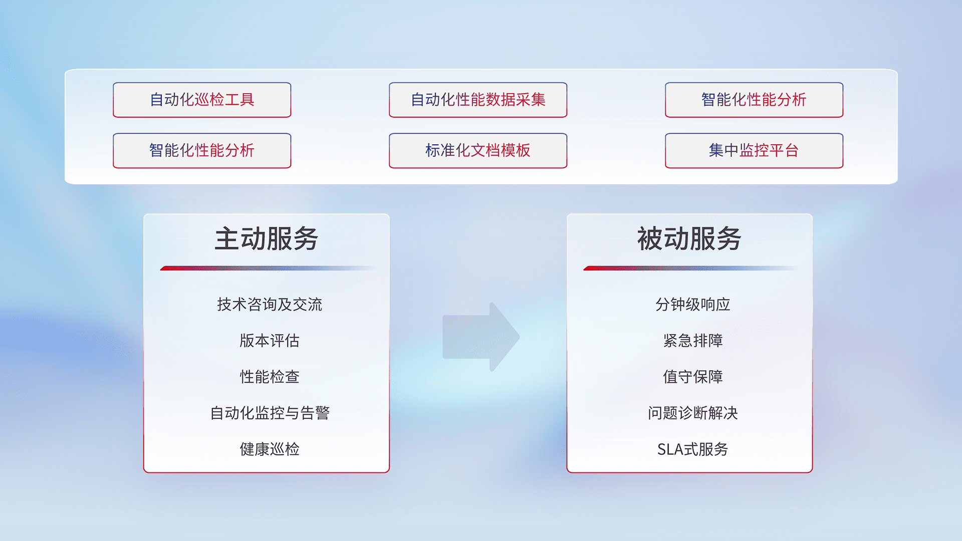 智能化工具和标准化文档,,,保障服务质量,,提供主动服务(包含技术咨询、、、版本评估、、性能检查、、、、自动化监控与告警、、、、健康巡检)和被动服务包含(分钟级响应、、紧急排障、、、、值守保障、、、问题诊断解决、、、SLA服务)。。