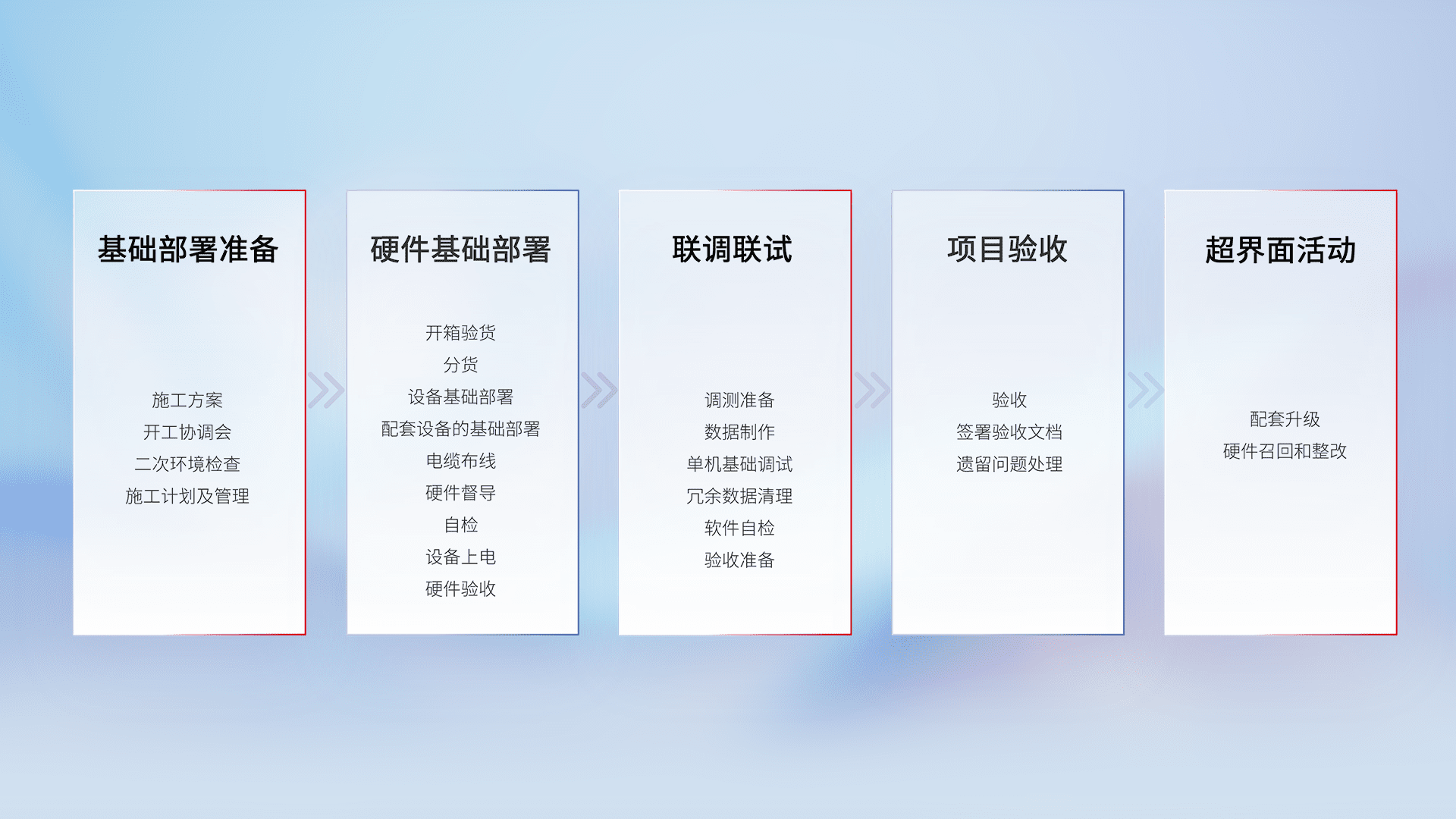 从基础部署准备、、、、硬件基础部署、、、联调联试、、、项目验收、、、、越界面活动的全过程可追溯,,,,保证施工质量和进度。。