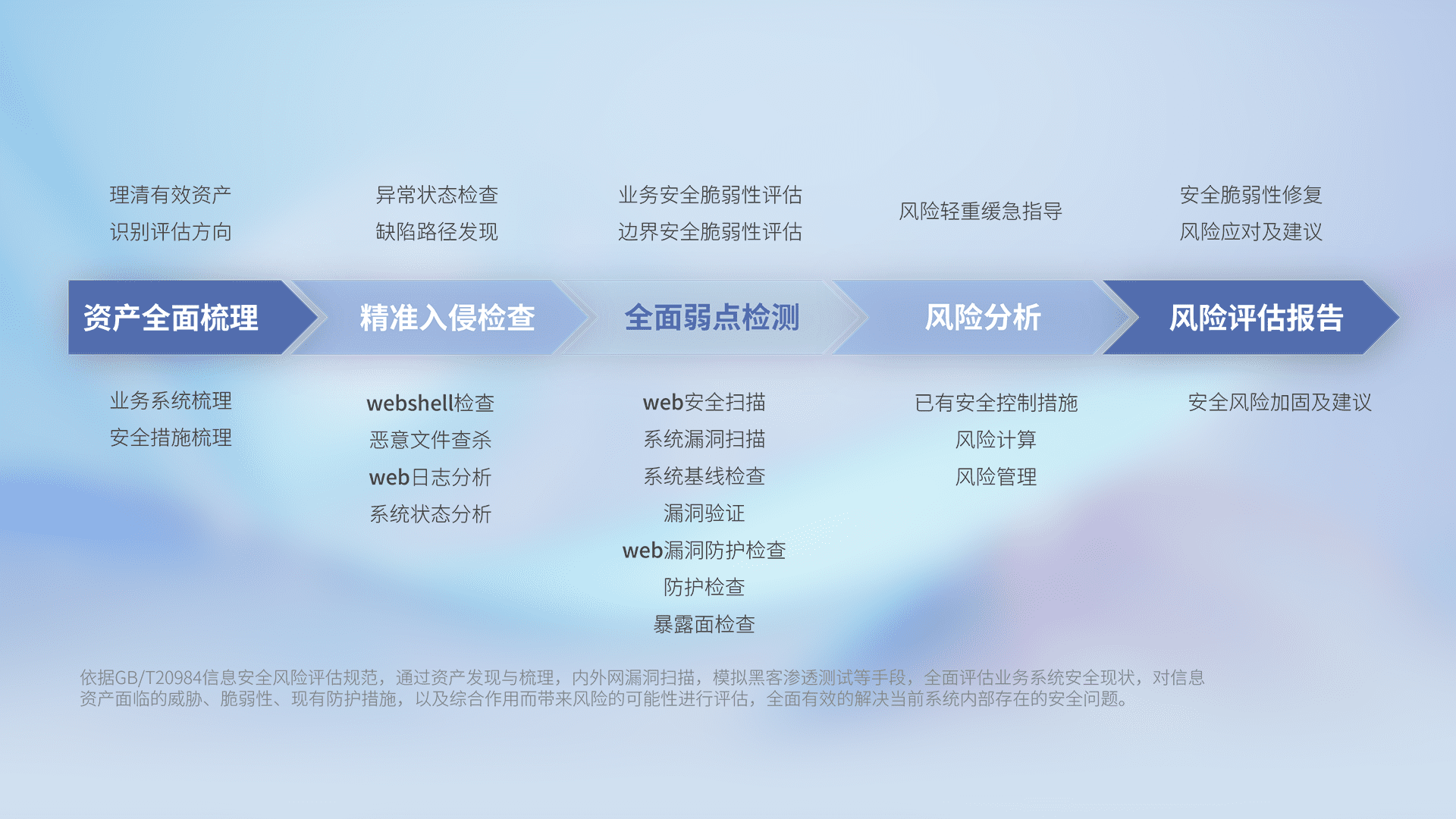 针对客户行业特性,,以专业的安全服务+多厂商联合解决方案提供专属的一站式安全管理服务,,,帮助客户全面感知网络空间威胁,,,基于识别、、、检测、、、分析、、、防护、、、、监测、、响应的服务理论模型,,,,从方案咨询、、集成交付、、评估验证、、、优化加固、、、、运维运营,,,致力于为客户提供完整的闭环管理式安全服务。。。。以实战经验为客户打造高抵御风险的安全体系,,,,帮助客户发现威胁、、、对抗威胁、、、处置威胁,,,不断积累安全对抗能力,,持续保障数字化安全。。。